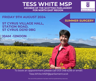 Information below on the Summer Surgery being held at the St Cyrus Village hall tomorrow with Tess White MSP.