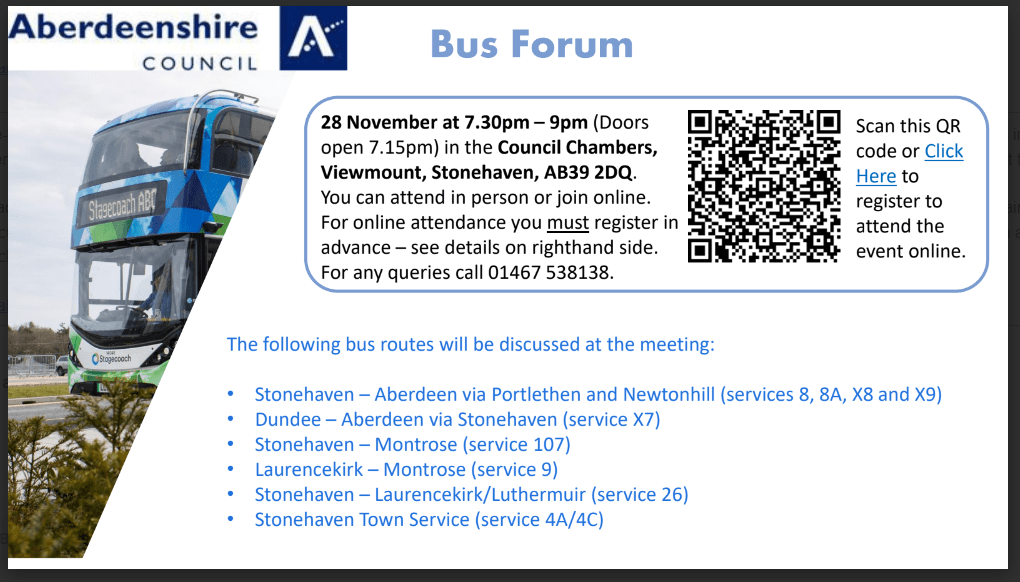 Details of the new timetables are attached to this email and will be available on the Council’s website at https://www.aberdeenshire.gov.uk/roads-and-travel/public-transport/a2b-dial-a-bus/kincardine-and-mearns-a2b/ from 28 October.